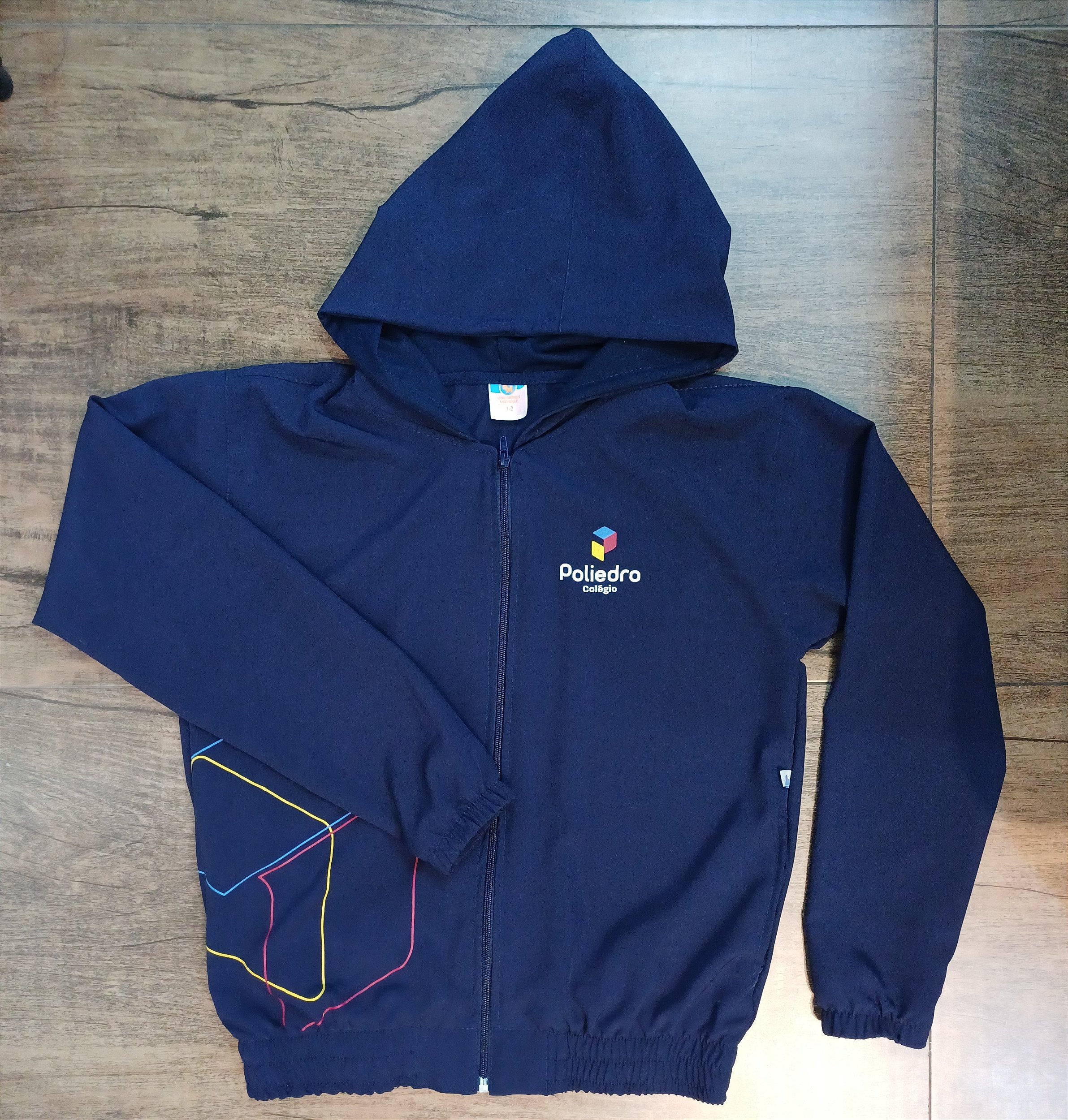 Jaqueta em microfibra azul marinho, sem forro, sem gorro.
